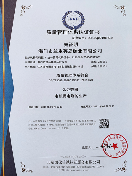 公司堅持以“質(zhì)量為先、信譽為重、管理為本、服務(wù)為誠”的企業(yè)精神,以市場為導向,堅持以“質(zhì)量求生存、科學求發(fā)展、管理求效益、真誠待客戶”的發(fā)展理念,于 2008 年通過IS09001:2000 質(zhì)量體系認證。復合金屬模壓電刷產(chǎn)品完全達到部頒 JB4003-85 標準并取得 CNAB 質(zhì)量認證。